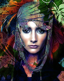 She does beautiful traditional vintage works as well. This is titled "Modern Vintage Woman", an apt title. What caught my eye on this was, aside from the doleful stare of the woman, the blocking of colors. She is so good at mixing the cool and warm colors so they don't compete but compliment. Here the orange and yellow over top the cooler colors gives a dimension to the piece that would have been lacking. She made certain to keep the face clear, as that is the focal point. I noticed that, like in many of her pictures, half of the face is covered. i like this aspect; each one of us has a hidden part of ourselves, something we don't like or don't want to share with the world. (I might be reading too much into this, but that is what she invites us to do!).
